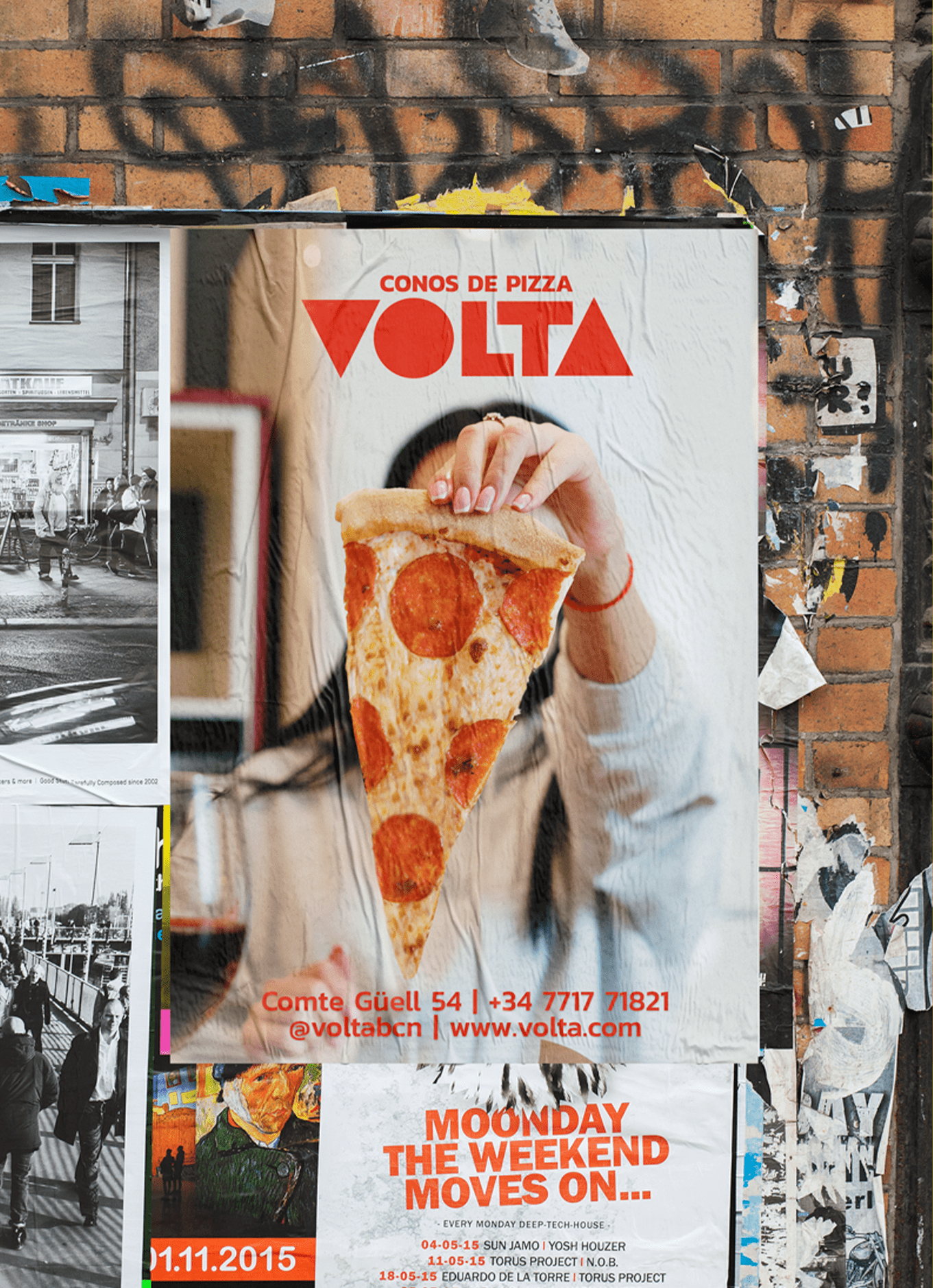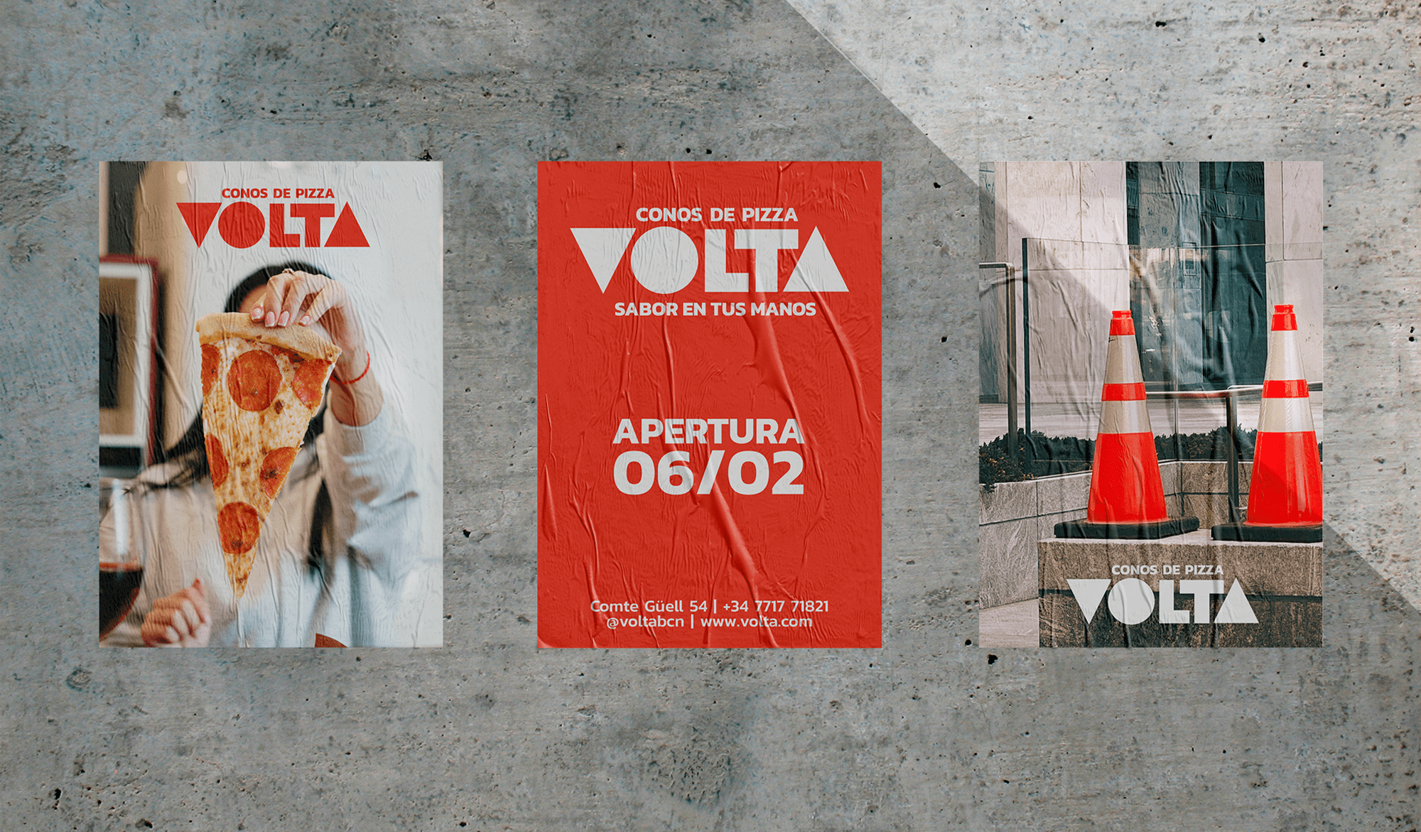 Volta es un proyecto personal a modo de portafolio. Representa ser una franquicia de pizzas que ofrece al público un enfoque diferente en el formato de las raciones. Los conos de pizza proporcionan una mayor cantidad de comida y también se distinguen de los productos de la competencia al realizar ventas únicamente en porciones.